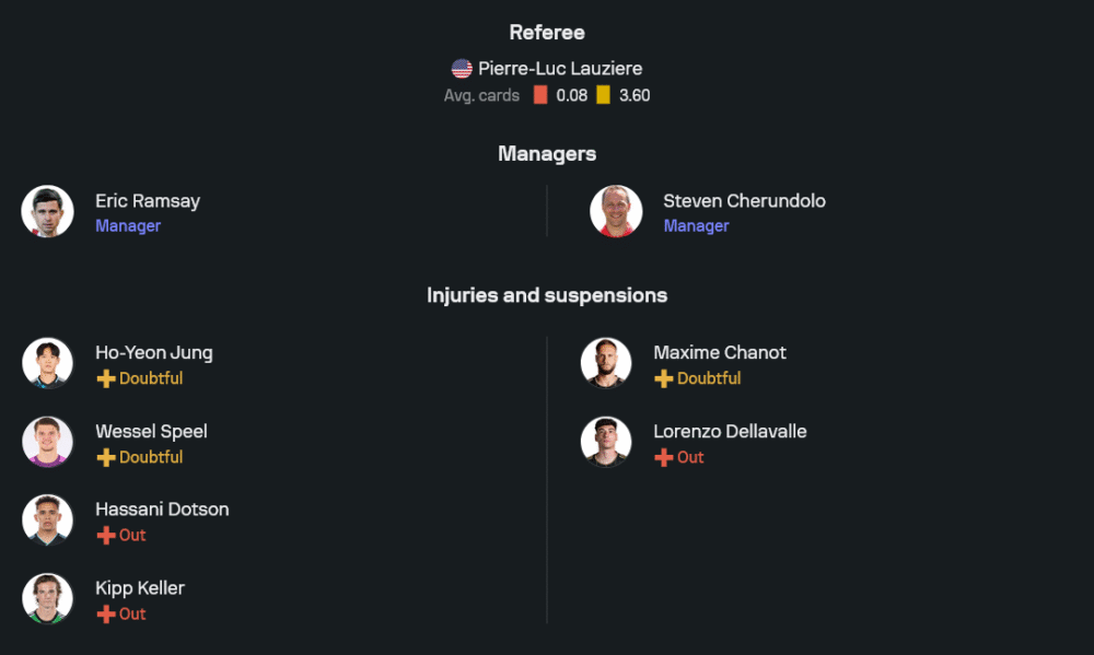 ฝั่งเจ้าบ้านภายใต้การคุมทีมของ เอริค แรมซีย์ เกมนี้มีข่าวร้ายเมื่อยังคงไร้เงา คิปป์ เคลเลอร์ และ ฮัสซานี่ ดอตสัน สองกำลังสำคัญที่เดี้ยงไปก่อนหน้า รวมไปถึงสองตัวหลักอย่าง โฮ-ยอน จุง และ เวสเซล สปีล ที่สภาพร่างกายยังน่าห่วง คาดว่ายังไม่พร้อมร้อยเปอร์เซ็นต์ แรมซีย์น่าจะยึดระบบ 5-3-2 วาง วิล แทรปป์ เป็นจอมทัพคุมเกมแดนกลาง ขณะที่คู่หน้าใช้ ทานี่ โอลูวาเซยี่ และ เคลวิน เยโบอาห์ ยืนประจำการ