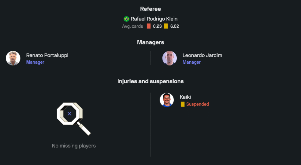 ทีมเยือนของ เลโอนาร์โด ยาร์ดิม มาแบบฟูลทีมเช่นกัน ขาดแค่ มาเตอุส เฮนริเก้ และ ชูเอา มาร์เซโล่ ที่เจ็บ แต่ไม่ได้กระทบแผนหลักมากนัก โดยยังใช้ระบบ 4-2-3-1 อัดมิดฟิลด์แน่นและเน้นสวนกลับไว นำโดยสามตัวรุก มาเธอุส เปเรย์ร่า, ไคโอ ฮอร์เก้ และลูคัส โรเมโร่ ป้อนบอลให้หน้าเป้า วานแดร์ซอน ที่พร้อมป่วนแนวรับเจ้าบ้านทุกจังหวะ