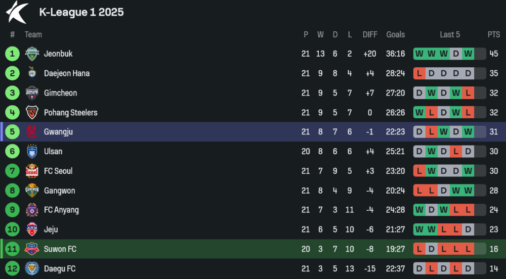 ซูวอน ซิตี้ ฟอร์มย่ำแย่ต่อเนื่องในลีก พวกเขาแพ้มา 3 นัดติดในบ้านตัวเอง ยิงได้เพียง 2 ลูกและเสียไปถึง 5 ลูก แถมเกมเยือนก็หนักหน่วง เสมอมา 2 แพ้ 1 จาก 3 นัดหลังสุด เรียกว่าเครื่องไม่ติดทั้งในบ้านและนอกบ้าน