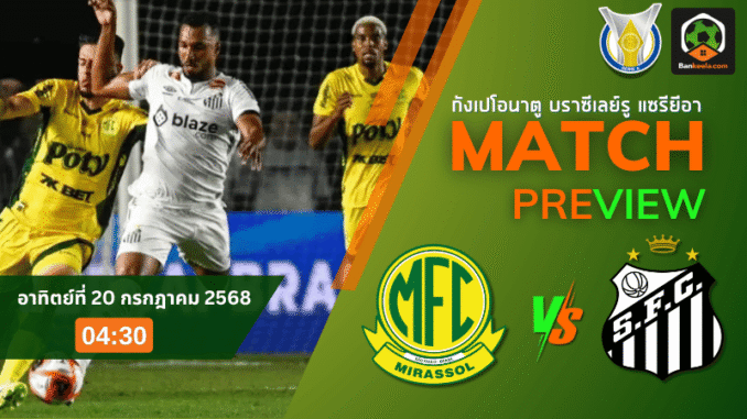 ค่ำคืนวันอาทิตย์ที่ 20 กรกฎาคม 2568 เวลา 04:30 น. ตามเวลาในบ้านเรา ฟุตบอล กังเปโอนาโต บราซีเลย์รู แซรียีอา จะระเบิดความมันส์ที่สนามเอสตาดิโอ โฆเซ่ มาเรีย เดอ คัมโปส ไมอา เมื่อ มิราสโซล ทีมอันดับ 11 พร้อมเปิดรังรับมือ ซานโต๊ส ทีมอันดับ 13 ที่กำลังคึกจัดทั้งคู่ โดย ราคาบอลวันนี้ เปิดมาแบบสูสี มิราสโซลต่อ ปป. ให้แฟนบอลได้ลุ้นกันสุดมันส์ เกมนี้ยังถือเป็นหนึ่งในคู่ไฮไลต์ของ ตารางบอลวันนี้ ที่คอบอลห้ามพลาดด้วยประการทั้งปวง