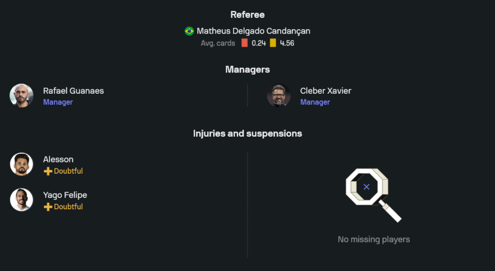 กุนซือ ราฟาเอล กัวนาเอส จัดทัพได้ค่อนข้างสมบูรณ์ แม้ อเลสซอน และ ยาโก้ เฟลิเป้ จะยังต้องเช็กความฟิต แต่ข่าวดีคือ เนโต้ มูร่า กองกลางตัวเก่งพ้นโทษแบนกลับมาเสริมแกร่งทันเวลา พร้อมทั้งนักเตะใหม่อย่าง เฟลิเป้ โจนาธาน และ อเลสซอน ที่เพิ่งย้ายมาร่วมทีมมีลุ้นลงสนามทันที เกมนี้ยังคงเน้นระบบ 4-4-2 เดินเกมรุกเต็มพิกัดตามสไตล์ในบ้าน
