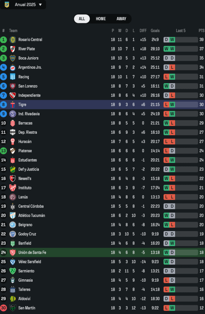 ยังไม่แพ้ใครใน 5 เกมหลังสุดทุกรายการ แสดงให้เห็นถึงความเหนียวแน่นทั้งเกมเหย้าและเยือน โดยนัดล่าสุดบุกไปยันเสมอโบคา จูเนียร์ส 1-1 ชนิดที่ได้ประตูนำก่อนจาก ตาร์ราโกน่า ก่อนจะโดนตีเสมอช่วงท้ายเกม ส่วนก่อนหน้านั้นก็เบียดชนะเอสตูเดียนเตส 1-0 ในบ้าน ถือว่าเป็นฟอร์มที่น่าจับตาอย่างยิ่งสำหรับทีมกลางตารางที่ต้องการเก็บแต้มอย่างต่อเนื่อง