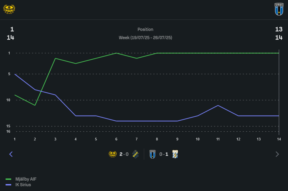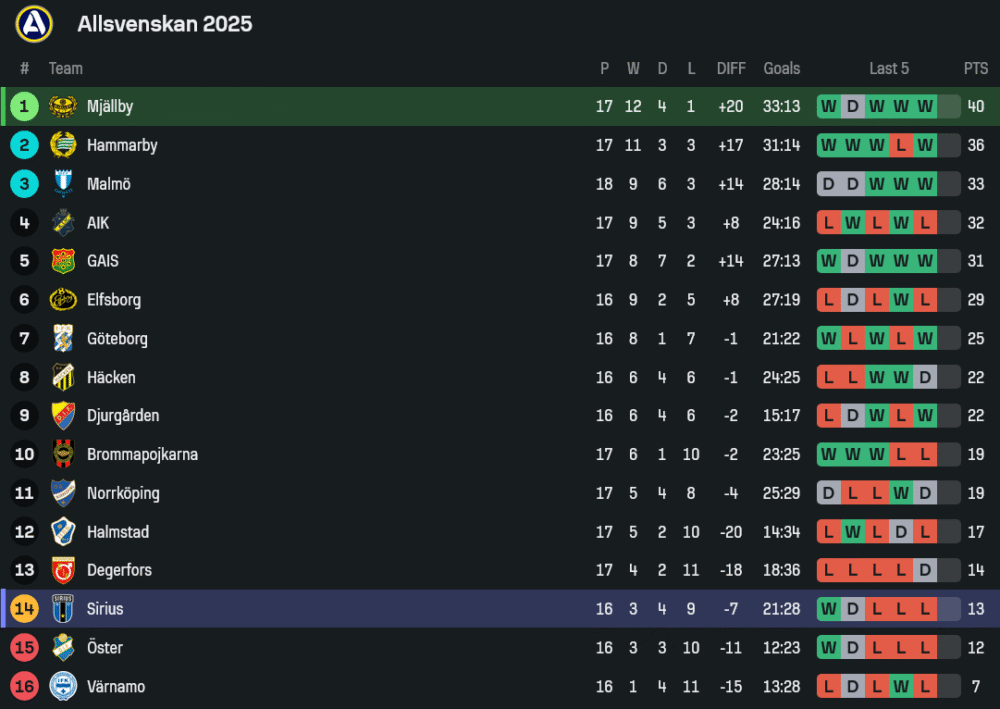 ซิริอุส: ฟอร์มสวนทางกันแบบสุดขั้ว แพ้รวด 3 เกมหลังในลีก ล่าสุดพ่ายคารังให้กับ โกเตบอร์ก 0-1 เกมเยือนก็ยังเละเทะ ชนะได้เพียงเกมเดียวจาก 8 นัดหลังสุด เสียถึง 17 ประตู สะท้อนให้เห็นถึงปัญหาในเกมรับที่ยังแก้ไม่ตก และทำให้พวกเขาต้องดิ้นรนอย่างหนักเพื่อหนีโซนท้ายตาราง