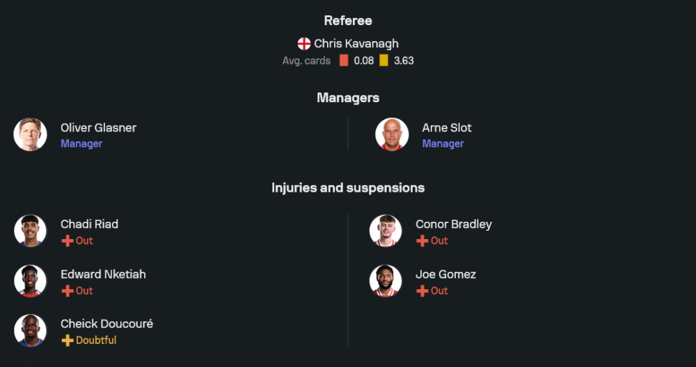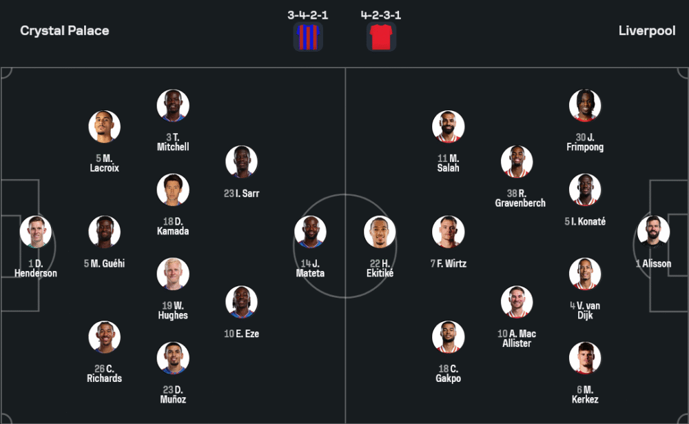 อาร์เน่อ สล็อต โล่งอกเมื่อไม่มีตัวเจ็บเพิ่มเติม นอกจาก โจ โกเมซ และ คอเนอร์ แบร็ดลี่ย์ ที่ยังพักฟื้น ส่วน เฟอร์กิล ฟาน ไดย์ค และ อลิสซง เบ็คเกอร์ กลับมาซ้อมได้แล้วและมีลุ้นลงตัวจริง คาดว่าจะจัดระบบ 4-2-3-1 ใช้ อูโก้ เอกิติเก้ ยืนหอกตัวเป้า โดยมี ฟลอเรียน เวียร์ตซ์ ทำเกมตรงกลาง และ โมฮาเหม็ด ซาล่าห์ คอยกระชากริมเส้น