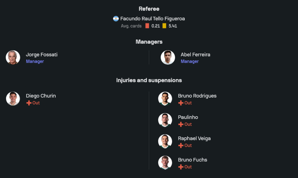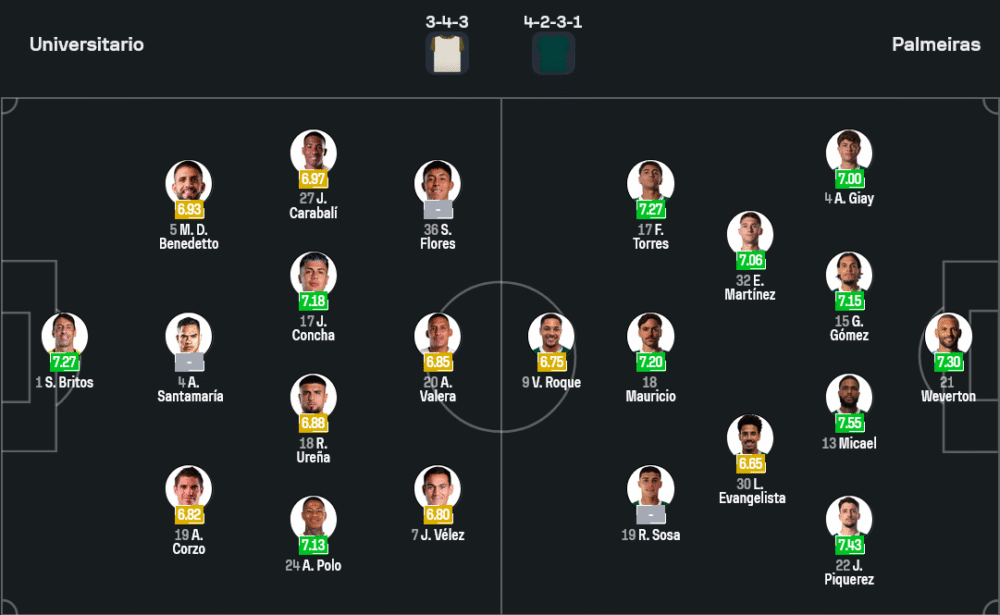ด้านทีมเยือนภายใต้การคุมบังเหียนของ อเบล แฟร์เรยร่า วางหมาก 4-2-3-1 นายด่านมือหนึ่ง เวเวอร์ตัน ยืนเฝ้าเสา แนวรับนำโดย ฆัวกิน ปิเกเรซ, มิคาเอล ดอส ซานโตส, กุสตาโว่ โกเมซ และ อากุสติน กิเอย์ แดนกลางใช้คู่ ลูคัส เอวานเจลิสตา และ อานิบาล โมเรโน แผงรุกประกอบด้วย รามอน โซซ่า, เมาริซิโอ ปราโด้ และ ฟาคุนโด ตอร์เรส โดยมี วิตอร์ โรเก้ เป็นหน้าเป้าล่าตาข่าย เกมนี้จะไม่มี บรูโน โรดริเกซ, เปาลินโญ, ราฟาเอล เวียก้า และ บรูโน ฟุช ที่เจ็บทั้งหมด