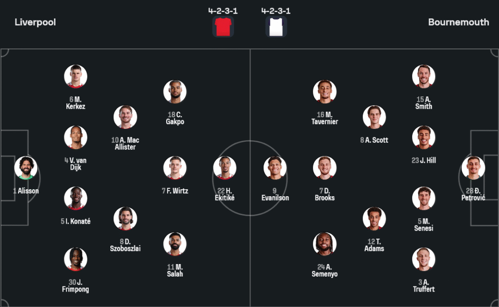 ฝั่งเจ้าบ้านของกุนซือ อาร์เน่ สล็อต มีปัญหาเล็กน้อยในแดนกลางเมื่อ ไรอัน กราเฟนเบิร์ช ติดโทษแบน และ สเตฟาน บายเซติช ยังไม่ฟิตสมบูรณ์ ขณะที่ คอเนอร์ แบรดลีย์ กับ โจ โกเมซ ต้องเช็กความฟิตก่อนเกม คาดว่าแผนหลักจะยังยึดระบบ 4-2-3-1 โดยให้ อูโก้ เอกิติเก้ ยืนหน้าเป้าพร้อมสนับสนุนจากสามแนวรุกตัวจี๊ด โมฮาเหม็ด ซาล่าห์, โคดี้ กั๊กโป และ ฟลอเรียน เวียร์ตซ์ ที่ฟอร์มช่วงปรีซีซั่นร้อนแรงสุด ๆ ขณะที่แนวรับยังมี อลิสซง, ฟาน ไดจ์ค, โกนาเต้ และ ฟริมปง คุมแผงอย่างเหนียวแน่น