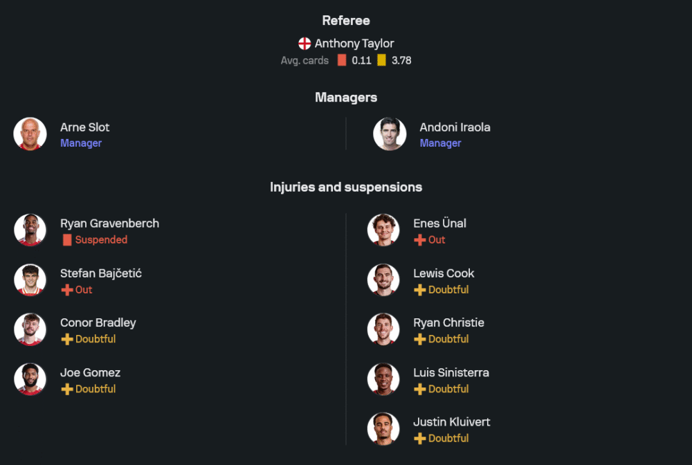 ด้านทีมเยือนของ อันโดนี่ อิราโอล่า ยังเผชิญปัญหาในหลายตำแหน่ง ไม่ว่าจะเป็นตัวหลักอย่าง หลุยส์ ซินิสเตร์ร่า, เอเนส อูนัล, จัสติน ไคลเวิร์ต, ไรอัน คริสตี้ และ ลูอิส คุก ที่สภาพร่างกายยังไม่พร้อมใช้งานทั้งหมด โดยแผนการเล่นจะยึด 4-2-3-1 เช่นกัน วาง อีวานิลซอน เป็นหน้าเป้า และให้ อ็องตวน เซม็องโย่, มาร์คัส ตาเวอร์เนียร์ และ เดวิด บรู๊คส์ ทำเกมรุกสนับสนุน อย่างไรก็ตาม คำถามใหญ่ยังอยู่ที่แนวรับว่าจะต้านเกมบุกของเจ้าถิ่นได้แค่ไหน เพราะหลายรายในแผงหลังยังขาดประสบการณ์ในเกมระดับนี้