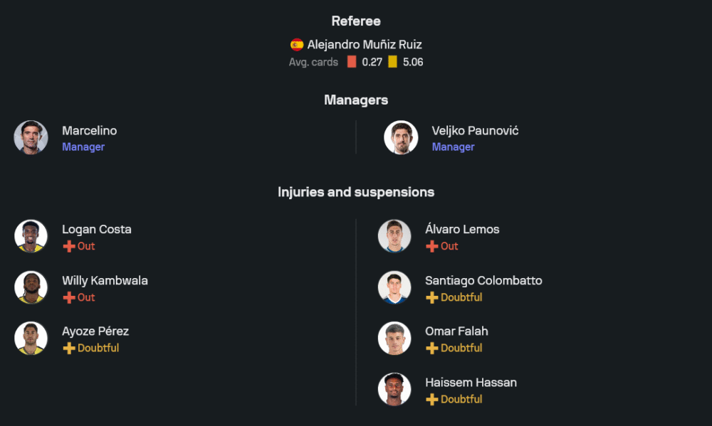 ฝั่งทีมเยือนของกุนซือ เวลย์โก้ เปาโนวิช ถือว่าเตรียมทีมมาได้ดีพอสมควร โดยเฉพาะการเสริมทัพที่น่าสนใจ ไม่ว่าจะเป็น ลูก้า อิลิช มิดฟิลด์ตัวรุกใหม่ที่ย้ายมาด้วยค่าตัว 2 ล้านยูโร และ ซาโลมอน รอนดอน ดาวยิงประสบการณ์สูงวัย 35 ปี ที่เข้ามาเพิ่มมิติในแดนหน้า ด้านตัวเก๋าอย่าง ซานติ กาซอร์ล่า ยังพร้อมสร้างสรรค์เกมเหมือนเดิม แม้อายุแตะหลัก 39 ปี แต่ฟอร์มยังคงแข็งแกร่ง การจัดทัพน่าจะใช้ระบบ 4-2-3-1 วาง รอนดอน เป็นหน้าเป้า โดยมี อิลยาส ไชร่า, แบรนดอน โดมิงเกส และ อิลิช หนุนหลังเต็มระบบ