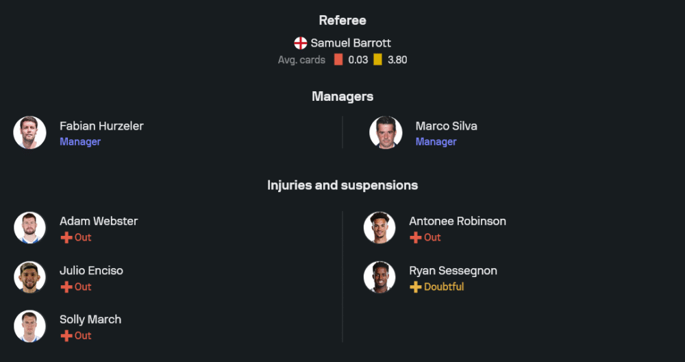 ฝั่งทีมเยือนของกุนซือ มาร์โก้ ซิลวา มีปัญหาน้อยกว่า ขาดเพียง แอนโทนี่ โรบินสัน แบ็กซ้ายตัวเก่งที่ยังเจ็บยาว ส่วนรายอื่นพร้อมลุยเต็มสูบ แผน 4-2-3-1 ถูกจัดทัพลงมาเช่นกัน นำโดย ราอูล ฆิเมเนซ ยืนหอกเดี่ยว และมี แฮร์รี่ วิลสัน, เอมิล สมิธ โรว์ และ อเล็กซ์ อิโวบี้ สนับสนุนอยู่ด้านหลัง โดยมีคู่กลางอย่าง ซานเดอร์ เบอร์เก้ และ ซาซ่า ลูคิช คอยคุมเกม ขณะที่แนวรับยังแข็งแกร่งด้วยคู่เซ็นเตอร์ โยอาคิม แอนเดอร์เซ่น และ แคลวิน บาสซี่ย์