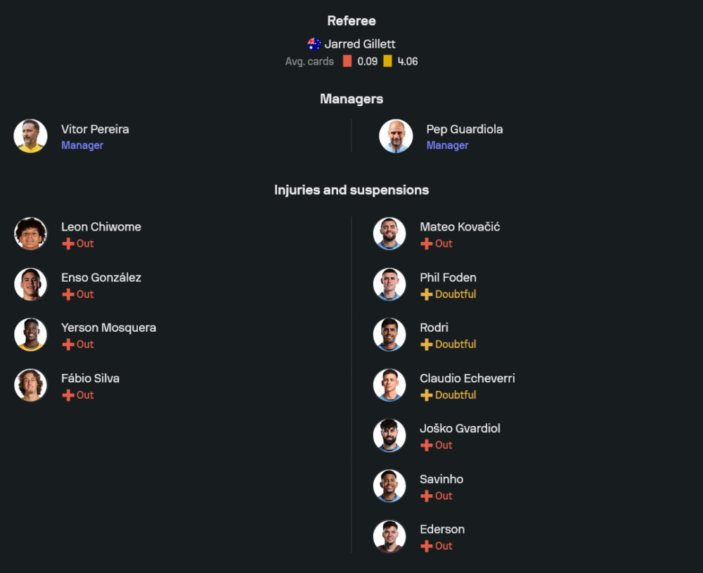 เป๊ป กวาร์ดิโอล่า มีตัวเจ็บอยู่บ้าง ไม่ว่าจะเป็น มาเตโอ โควาซิช, เอแดร์ซอน, ซาวินโญ่ และ ยอสโก้ กวาร์ดิโอล ขณะที่สามแข้งหลักอย่าง โรดรี้, ฟิล โฟเด้น และ เอเซเวร์รี่ ยังต้องเช็กความฟิต อย่างไรก็ตามคาดว่า 11 ตัวจริงยังคงอัดแน่นไปด้วยความเก๋าและความโหด โดยมี เออร์ลิ่ง ฮาลันด์ ยืนค้ำหน้า ประสานกับ ริยาด แชร์กี้, เจเรมี่ โดคู และ โอมาร์ มาร์มูช บดแหลกในแนวรุก พร้อมส่ง จอห์น สโตนส์ กับ รูเบน ดิอาส คุมแนวรับ