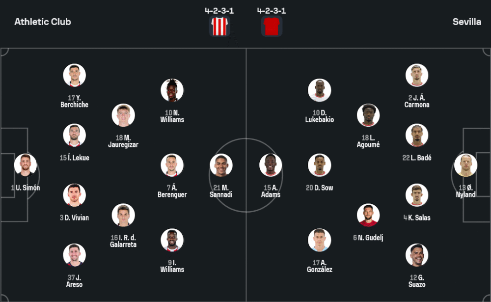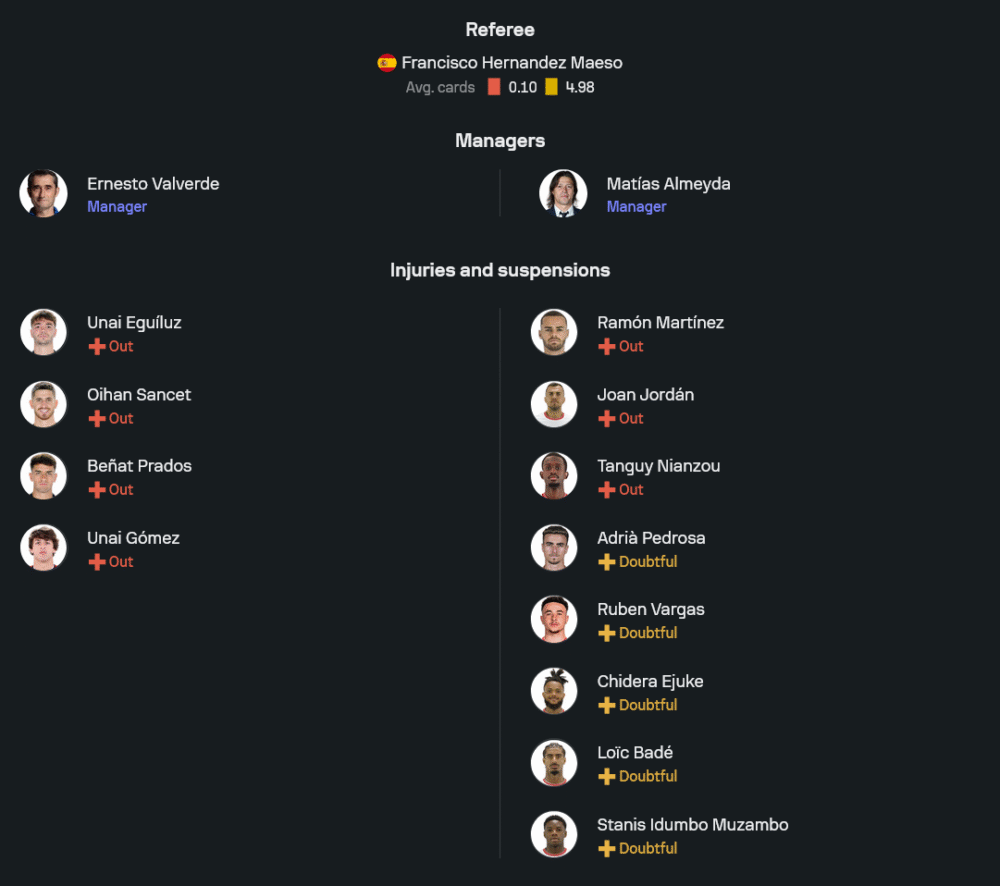 ของกุนซือ เอร์เนสโต้ บัลเบร์เด้ เจอปัญหาใหญ่เรื่องสภาพทีมหลายจุด โดยเฉพาะแนวรับที่ต้องขาด เยราย อัลบาเรซ จากการติดโทษแบน ยังไม่รวมกับเหล่าแข้งเจ็บอย่าง อูไน เอกิลุซ, เบนญัต ปราดอส และ โออิฮาน ซานเซ็ต ที่นอนโรงหมอยาว คาดว่าแนวรุกจะใช้ มารวน ซานนาดี้ ยืนค้ำหน้า โดยมีสองพี่น้อง อินญากี้ และ นิโก้ วิลเลี่ยมส์ เติมสปีดทางริมเส้น