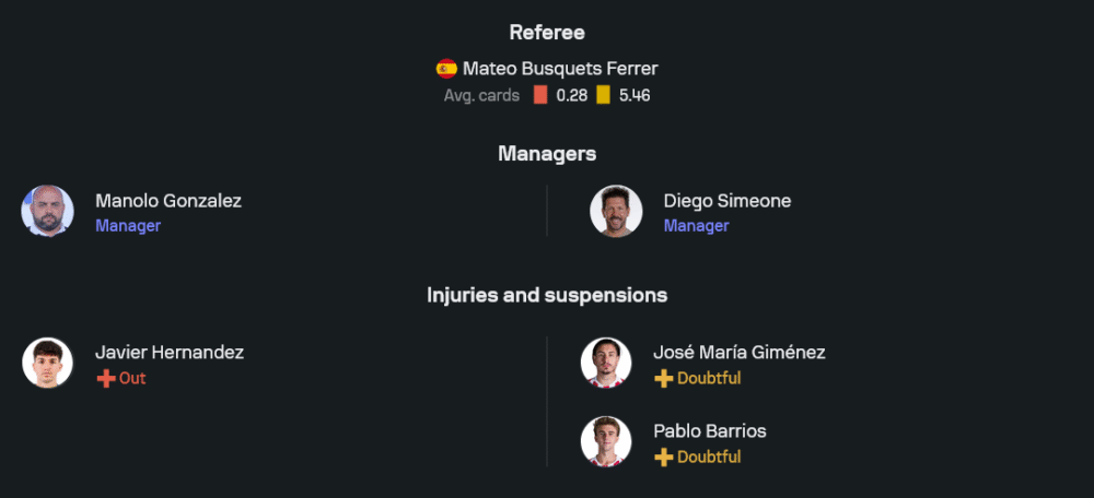 ของกุนซือจอมเขี้ยว ดิเอโก้ ซิเมโอเน่ แม้จะต้องเช็คฟิต โฆเซ่ มาเรีย คิเมเนซ แต่โดยรวมถือว่าอยู่ในสภาพทีมที่สมบูรณ์ พร้อมใช้งาน 3 แข้งใหม่อย่าง อเล็กซ์ บาเอน่า, ดาบิด ฮานโก้ และ จอนนี่ การ์โดโซ่ โดยจะส่ง ฮูเลี่ยน อัลวาเรซ เป็นตัวทีเด็ดในแดนหน้า ลุยในระบบ 4-2-3-1 ซึ่งเป็นแผนที่ทีมถนัดและวางใจได้