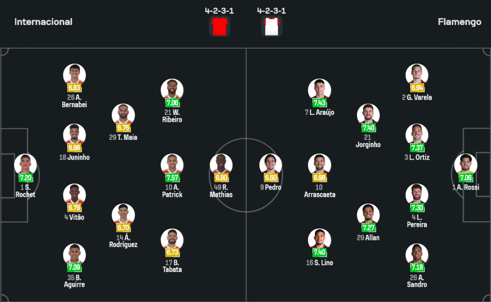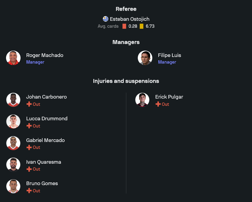 ฟิลิเป้ ลุยส์ กุนซือคนเก่งของทีมเยือน มีข่าวดีตรงที่นักเตะหลักส่วนใหญ่พร้อมรบเกือบครบ ยกเว้น เอริค ปุลก้า กองกลางตัวรับที่เจ็บอยู่ และ มิเชล ปีกจอมเลื้อยที่หายหน้าไปพักใหญ่ อย่างไรก็ตาม ฟลาเมงโก้ยังจัดเต็มได้ในแผน 4-2-3-1 นำโดย เลโอ เปเรร่า คุมแนวรับ, อาร์ราสกาเอต้า เป็นจอมทัพแดนกลาง และให้ เปโดร ยืนหน้าเป้าเป็นตัวทีเด็ดเช่นเคย