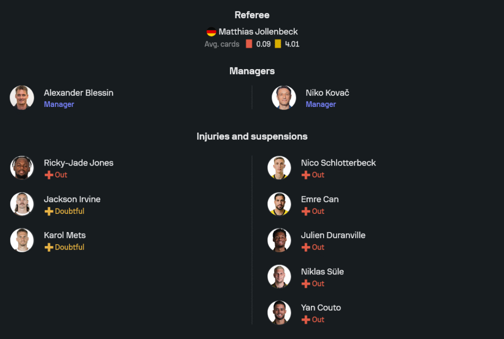 นิโก้ โควัช เฮดโค้ชของเสือเหลืองก็เจอปัญหาผู้เล่นเจ็บเช่นกัน โดยไร้ชื่อ นิโค ชล็อตเตอร์เบ็ค, นิคลาส ซูเล่, เอ็มเร่ คาน, จูเลียน ดูรันวิลล์ และ ยาน คูโต้ ที่เดี้ยงทั้งหมด แต่ยังมีขุมกำลังหลักพร้อมลงสนาม ระบบ 3-4-1-2 จะวาง เกรกอร์ โคเบล เฝ้าเสา แนวรับสามคนมี วัลเดมาร์ อันตอน, รามี่ เบนเซไบนี่, ยูเลี่ยน ไรเออร์สัน กลางสนามใช้ ปาสกาล โกร้สส์ ประสานกับ มาร์เซล ซาบิตเซอร์ ขณะที่ตัวทำเกมคือดาวรุ่งสุดฮอต โจ๊บ เบลลิ่งแฮม คอยปั้นให้คู่หัวหอก คาริม อเดเยมี่ และ เชห์รู กีราสซี่ จบสกอร์