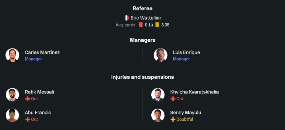 หลุยส์ เอ็นริเก้ จะไม่สามารถใช้งาน ควิชา ควารัตสเคเลีย ที่เจ็บ และยังไม่มี เซนนี่ มายูลู เช่นเดียวกัน ขณะที่ระบบการเล่นคาดว่าจะยังเป็น 4-3-3 นำโดยสามประสานแนวรุกอย่าง อุสมาน เดมเบเล่, แบรดลีย์ บาร์โคล่า และ วอร์เรน ซาอีร์-เอเมรี่ ส่วนแดนกลางวาง บรูโน่ เนเวส และ วิตินญ่า ช่วยปั้นเกม พร้อมด้วยแนวรับที่มี มาร์กินญอส เป็นหัวใจสำคัญ