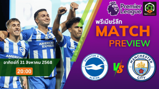 พรีเมียร์ลีก ค่ำคืนวันอาทิตย์ที่ 31 สิงหาคม 2568 เวลา 20:00 น. สนามเอเม็กซ์ สเตเดี้ยมจะคึกคักสุดขีดเมื่อ ไบรท์ตัน โฮฟ อัลเบี้ยน เปิดบ้านรับมือแชมป์เก่าอย่าง แมนเชสเตอร์ ซิตี้ เกมที่ทั้งสองฝ่ายต้องการสามแต้มเพื่อยกระดับอันดับช่วงต้นซีซั่น เรตหน้าเสื่อขยับล่าสุดให้ทีมเยือนบุกต่อครึ่งลูกแบบลบสิบ สะท้อนความมั่นใจในศักยภาพของเรือใบสีฟ้า แต่เมื่อได้เล่นในรังต่อหน้าแฟนบอล “นกนางนวล” ก็พร้อมขู่ใส่เต็มเสียง นี่คือหนึ่งในแมตช์ที่ถูกขีดเส้นแดงบน ตารางบอลวันนี้ ว่า “ต้องดูให้ได้” เพราะมีครบทั้งความเร็ว เกมรุกจัดจ้าน และหมากต่อหมากในแดนกลาง