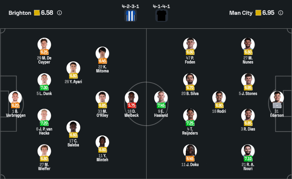 หมากหลักคือการคอนโทรลด้วยโรดรี้และการ “โอเวอร์โหลด” ด้านขวาให้แบร์นาร์โด้จับมือโฟเด้นเจาะระหว่างไลน์ แล้วสลับเปิดกว้างให้โดคูฉีกซ้ายรอเล่นหนึ่งต่อหนึ่ง จุดชี้ขาดคือความนิ่งในจังหวะจบของ ฮาลันด์ หากได้บอลหน้าปากประตูมากพอ ไบรท์ตันฯ จะต้องระวังเป็นพิเศษ นอกจากนี้ผู้ตัดสิน ดาร์เรน อังกฤษ ที่มีสถิติค่าเฉลี่ยใบเหลืองต่อเกมระดับกลางๆ อาจทำให้เกมไหลลื่น มีโอกาสเห็นจังหวะบุกสวนไปมามากกว่าจะถูกเป่าหยุดถี่