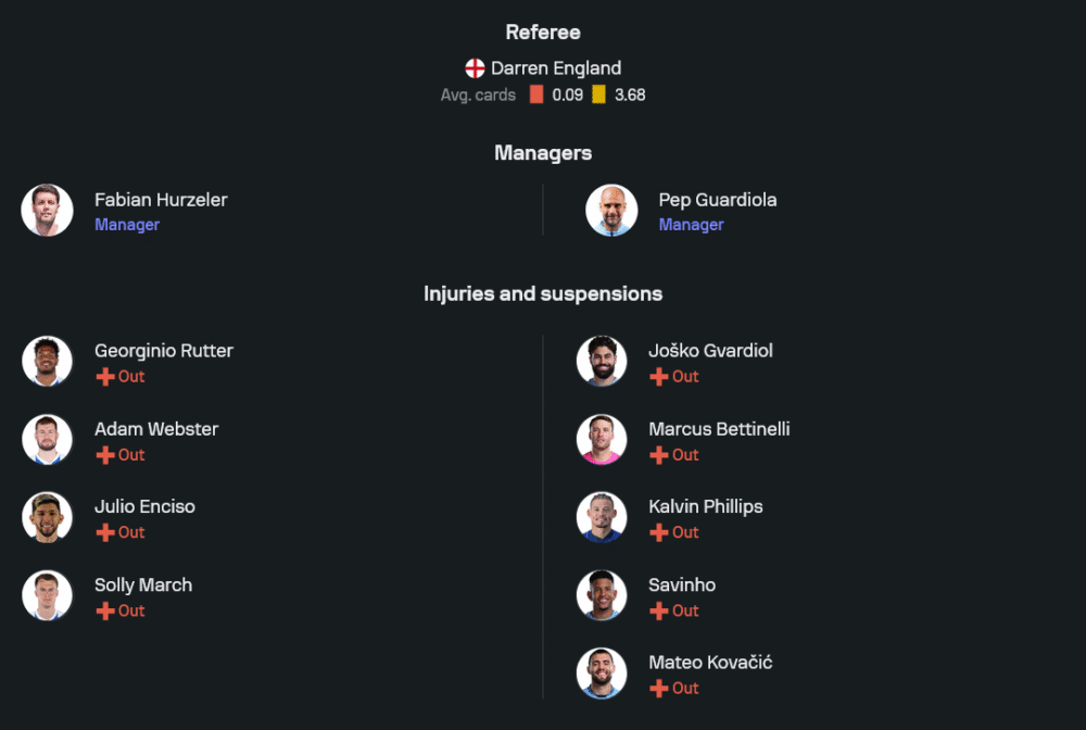 เฮดโค้ชหนุ่มไฟแรง ฟาเบียน ฮูร์เซเลอร์ ยังต้องรับมือปัญหาตัวเจ็บหลายตำแหน่งจากชุดข้อมูลล่าสุดที่เราได้เห็นในภาพประกอบ ไม่ว่าจะเป็น โซลลี มาร์ช, ฆูลิโอ เอ็นซิโซ่, อดัม เว็บสเตอร์ รวมถึงชื่อของ จอร์จินิโอ รูตแตร์ ที่ถูกระบุว่ายังพักยาว ทำให้การหมุนเวียนแนวรุกจำเป็นต้องพึ่งความคล่องของ คาโอรุ มิโทมะ กับ ยานกูบา มินเตห์ ขณะที่แดนกลางใช้ การ์ลอส บาเลบา คู่ ยาซิน อายารี่ คอยคุมจังหวะ หน้าต่ำมอบหมาย แม็ตต์ โอไรลี่ย์ เป็นตัวสร้างสรรค์ และ แดนนี่ เวลเบ็ค ยืนหอกเป้าคอยชนกับคู่เซ็นเตอร์ทีมเยือน แนวรับต้องฝากความนิ่งไว้กับกัปตัน ลูอิส ดังค์ จับคู่ แยน ปอล ฟาน เฮ็คเก้ ส่วนกรอบเขตโทษมี บาร์ต แฟร์บรูคเคิน เฝ้าเสา