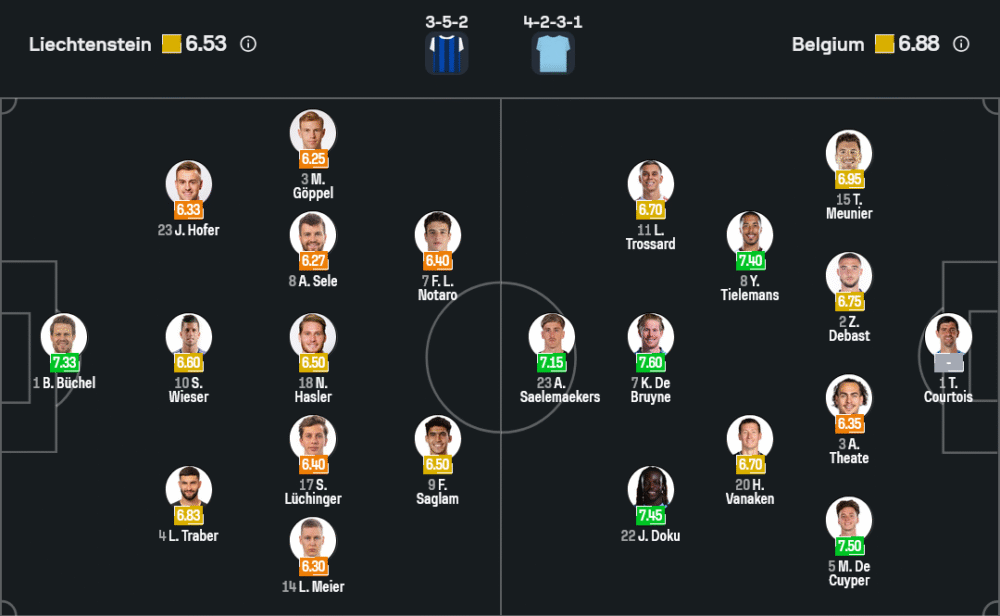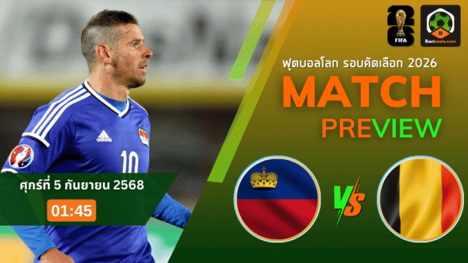 ยังต้องกาชื่อ อามาดู โอนานา และ โรเมลู ลูกากู ที่ไม่พร้อม แต่ภาพรวมของแนวรุกวันนี้ยังจัดเต็มและอันตรายจากทุกช่องทาง ผู้ตัดสินคือ มอร์ตัน โครกห์ เชิ้ตดำเดนมาร์ก ค่าเฉลี่ยใบเหลือง 4.19 ใบต่อเกม คาดว่าเกมจะถูกคุมให้ไร้จังหวะแข็งเกินเหตุ แต่ความเร็วของปีกเบลเยียมจะบีบให้แนวรับลิกเตนสไตน์ต้องฟาวล์ตัดเกมบ่อย
