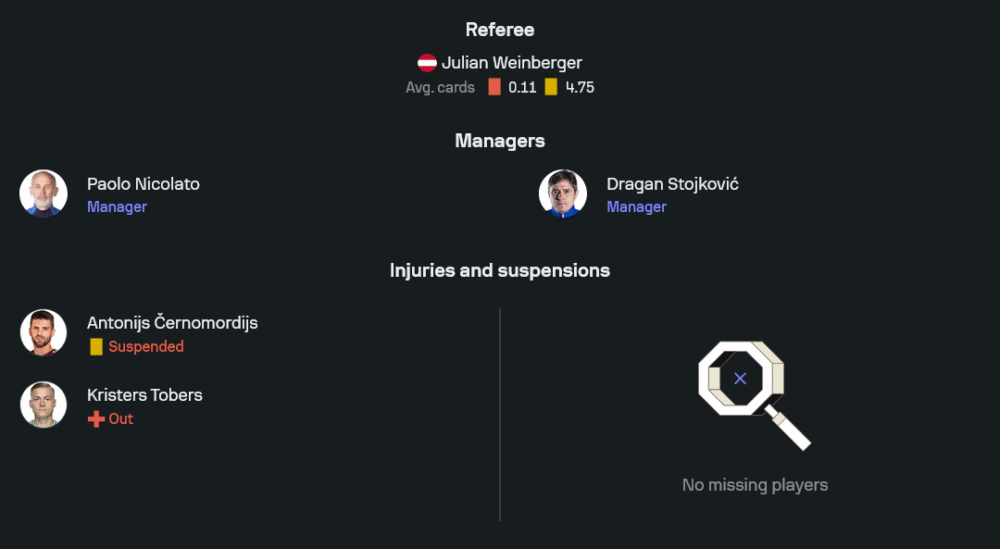 กุนซือ เปาโล นิโกลาโต้ เจอปัญหาใหญ่ในเกมนี้เพราะขาด อันโตนิจส์ เชอร์โนมอร์ดิจส์ กองหลังที่ติดโทษแบนสะสมใบเหลืองครบ และยังไม่มี คริสเตอร์ส โทเบอร์ส ที่บาดเจ็บหมดสิทธิ์ลงสนาม ทำให้ต้องปรับแนวรับอย่างหลีกเลี่ยงไม่ได้ แผนที่คาดว่าจะใช้คือ 5-4-1 เน้นเกมรับเหนียวแน่นและรอโต้กลับ โดยมี วลาดิสลาฟส์ กุตคอฟสกี้ส์ เป็นความหวังแดนหน้า