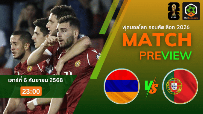 ค่ำคืนวันเสาร์ที่ 6 กันยายน 2568 เวลา 23:00 น. สนามวาซเก้น ซาร์กสยาน อันวาน ฮานราเปตาคาน มาร์ซาดาชต์ จะลุกเป็นไฟเมื่อทีมชาติอาร์เมเนียเปิดบ้านรับมือทีมแกร่งของทวีปยุโรปอย่างโปรตุเกส ศึกคัดบอลโลก 2026 กลุ่ม F เกมนี้กระแสก่อนแข่งเทไปที่ผู้มาเยือนแบบชัดเจน อัตรา ราคาบอล ล่าสุดเปิดให้โปรตุเกสต่อ 2.25 (-10) สะท้อนช่องว่างเชิงคุณภาพระหว่างขุมกำลังทั้งสองฝั่งได้เป็นอย่างดี แฟนบอลที่ไล่เช็กโปรแกรมจาก ตารางบอลวันนี้ มักปักหมุดแมตช์นี้เป็นคู่ทำเงิน เพราะแนวรุก “ฝอยทอง” กำลังเข้าฝักและมีตัวจบสกอร์ที่ไว้ใจได้ทุกนาที