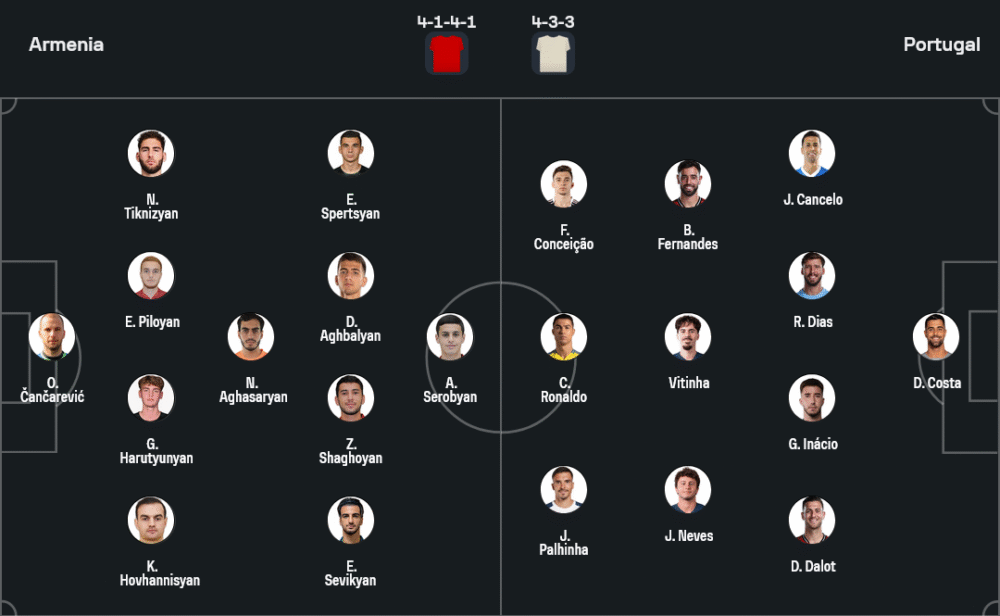 โรแบร์โต้ มาร์ติเนซ เรียกชุดใหญ่แบบไฟแรง ไม่มีรายงานตัวหลักถอน ล่าสุดจากภาพไลน์อัพเป็น 4-3-3 ที่แสนลงตัว ผู้รักษาประตูดิโอโก้ คอสต้า เฝ้าเสา แผงหลังสี่คนมีชูเอา คันเซโล–รูเบน ดิอาส–กอนซาโล่ อินาซิโอ–ดิโอโก้ ดาโลต์ กลางสามใช้ชูเอา ปาลินญ่าเป็นสมอ คอยเคียงข้างวิตินญ่าและเจา เนเวส เพื่อปลดล็อกพื้นที่แดนบน ส่วนหน้ายิงคือฟรานซิสโก คอนไซเซา ทางขวา บรูโน่ แฟร์นานเดสยืนยึกยักเชื่อมเกมเป็นฟรีโรล และกัปตัน คริสเตียโน่ โรนัลโด้ สแตนด์บายจบสกอร์ตรงกลาง ทั้งหมดนี้ยืนยันคุณภาพดีกรีท็อประดับทวีป พร้อมกดดันแนวรับเจ้าบ้านตั้งแต่นาทีแรก