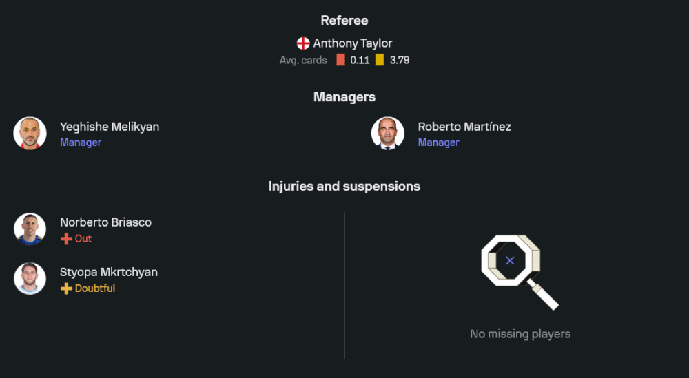 ทีมของกุนซือเยกิเช เมลิคยานได้เปรียบตรงเล่นในถิ่น ทว่าข่าวทีมไม่เต็มร้อย แนวรุกเชื้อสายอาร์เจนไตน์อย่างนอร์แบร์โต้ บริอัสโก (Out) ไม่มีชื่อแน่นอน ขณะที่สตโยปา เอ็มเครตชยาน ถูกประเมินเป็นเครื่องหมายคำถามว่าจะผ่านฟิตทันหรือไม่ โครงสร้างทีมจากภาพไลน์อัพล่าสุดสะท้อนความตั้งใจชัดเจนว่าจะเน้นวินัยเกมรับ ใช้ 4-1-4-1 หรือปรับเป็นไลน์ห้าเมื่อต้องถอยต่ำ แดนกลางวางนิคิต้า อกาซาเรียนคุมจังหวะ ป้อนบอลให้เอดูอาร์ด สเปอร์ทสยานและซีรูเซอ โชกอยานเชื่อมไปยังหัวหอกอาร์เซน เซโรเบียน พร้อมตัวริมเส้นอย่างนาเอียร์ ติกนิซยานช่วยยืดสนามและเปิดใส่เขตโทษ