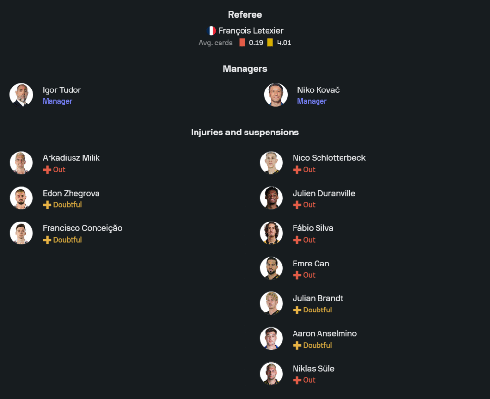 ฝั่งทีมเยือนของ นิโก้ โควัช แม้จะชนะมา 2 นัดติดในลีก แต่ก็ยังเจอปัญหาผู้เล่นบาดเจ็บเพียบ ไล่ตั้งแต่ นิโค่ ชลอตเตอร์เบ็ค, เอ็มเร่ ชาน, นิโคลัส ซูเล่ และ ฟาบิโอ ซิลวา ที่ต้องพักยาว ขณะที่ ยูเลี่ยน บรันด์ท และ อารอน อันเซลมิโน่ ยังต้องรอทดสอบความฟิต แผงหลังจัด วัลเดมาร์ อันตอน ยืนคู่ รามี่ เบนเซไบนี่ โดยมี เกรกอร์ โคเบล เฝ้าเสา แดนกลางใช้พลังสดจาก เฟลิกซ์ เอ็นเมชา คุมเกม ส่วนแนวรุกฝากความหวังไว้กับ เชห์รู กีราสซี่ ที่กำลังอยู่ในช่วงฟอร์มฮอต ประสานงานกับ คาริม อเดเยมี่ และ มักซิมิเลี่ยน ไบเออร์