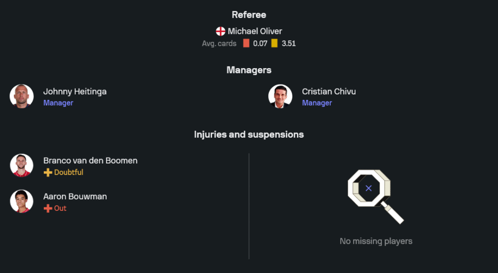 ภาพไลน์อัพจากห้องข่าวชี้ชัดว่า จอห์นนี่ ไฮติงก้า เตรียมยืนระบบ 4-2-3-1 ผู้รักษาประตู วิตเซสสลาฟ ยารอส เฝ้าเสา แบ็กขวา อันตอน กาอี ซ้ายเป็น โอเว่น วินดาล คู่เซ็นเตอร์วาง โยซิป ซูตาโล่ ยืนกับ โค อิตาคูระ คู่มิดฟิลด์ตัวคุมจังหวะเป็น ดาวี่ คลาสเซ่น และ เคนเน็ธ เทย์เลอร์ สามตัวรุกด้านหลังหน้าเป้าใช้ ร็อบบี้ โมโร ทางขวา ตรงกลางเป็น ออสการ์ กลูคห์ ซ้าย สตีเฟ่น เบิร์กฮุยส์ ส่วนหัวหอกคือ เวาท์ เว็กฮอร์สต์ ที่พร้อมชนกับแนวรับแกร่งของงูใหญ่ สภาพทีมยังต้องเช็กฟิต บรังโก้ ฟาน เดน บูเมน ขณะที่ อารอน บาวแมน หมดสิทธิ์ แต่โดยรวมโครงสร้างหลักอยู่ครบ ทำให้การบีบสูงและสลับเพรสซิ่งเป็นชุดยังคงใช้งานได้เต็มระบบ