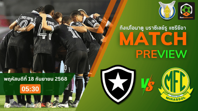 ค่ำคืนเช้าวันพฤหัสบดีที่ 18 กันยายน 2568 เวลา 05.30 น. ตามเวลาบ้านเรา สนามโอลิมปิโก นิลตัน ซานโตส จะส่องไฟสว่างไสวรอต้อนรับศึกใหญ่ของกังเปโอนาตู บราซีเลย์เรา แซรียีอา เมื่อ โบตาโฟโก้ ทีมอันดับ 6 เปิดบ้านดวล มิราสโซล ทีมอันดับ 4 เกมนี้มีความหมายยิ่งกว่าคะแนนธรรมดา เพราะทั้งสองต่างกำลังแย่งพื้นที่กลุ่มนำอย่างดุเดือด อัตรา ราคาบอล ขยับให้โบตาโฟโก้เป็นต่ออยู่ที่ 0.75-10 สะท้อนความได้เปรียบเรื่องถิ่นฐานและคุณภาพแนวรุกที่จัดจ้าน ใครกำลังวางแผนตีตั๋วดูบอลหรือจดเวลาไว้ใน ตารางบอลวันนี้ ห้ามพลาด เพราะแมตช์นี้มีทุกอารมณ์ครบทั้งแท็กติก ความเร็ว และแรงปะทะสไตล์บราซิเลียนขนานแท้