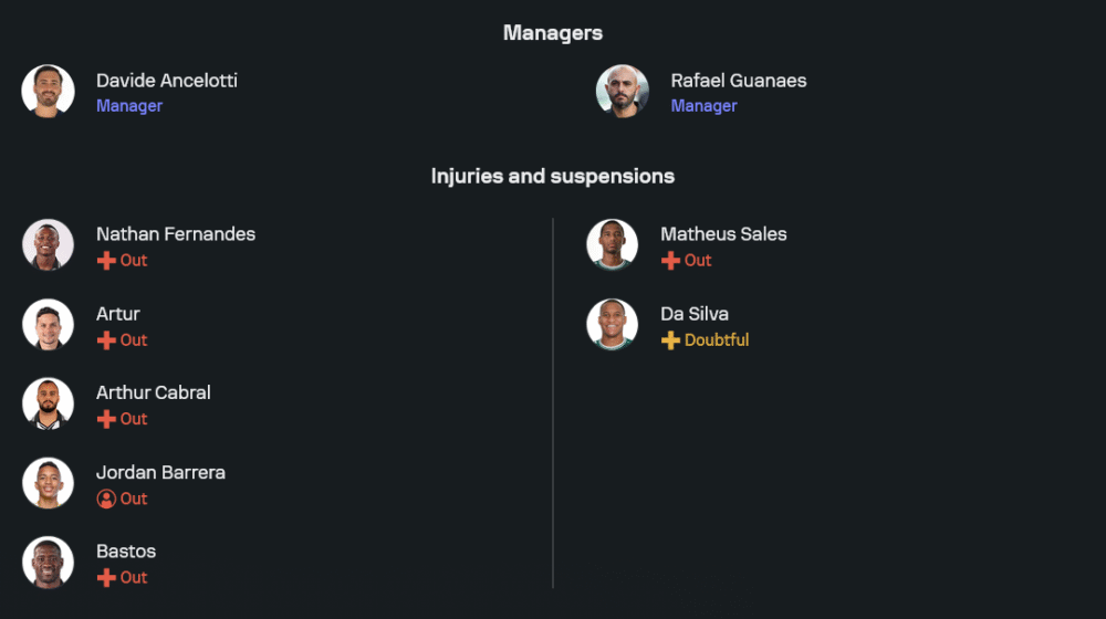 จากภาพข้อมูลทีมสต๊าฟบนบอร์ดข่าวชื่อของ ดาวิเด อันเชล็อตติ รับหน้าที่กุนซือใหญ่ และต้องจัดทีมโดยไร้เงาขุมกำลังหลายรายที่เจ็บยาว ไม่ว่าจะเป็น เนธาน แฟร์นานเดส, อาร์ตูร์, อาร์ตูร์ กาบราล, จอร์แดน บาเรร์รา และ บาสโตส แต่โครงสร้างหลักยังครบถ้วน ระบบที่คาดคือ 4-2-3-1 ผู้รักษาประตู เลโอ ลิงค์ ยืนเฝ้าเสา แผงหลังสี่คนจากขวาไปซ้าย วิตินโญ่, เคลาดิโอ ปันตาเลา, อันตอนิโอ บาร์โบซา และ อเล็กซ์ เตลลิส กลางรับสองตัวเป็น มาเธอุส เฟรตาส จับคู่ ดานิโล่ สามแนวรุกสนับสนุนหน้าเป้าใช้ เจฟฟินโญ่ ทางซ้าย, ฮวน ซาวาริโน่ ยืนกลาง และ อเลฮานโดร มอนโตโร่ ทางขวา หน้าเป้าไว้ใจ คริสโตเฟอร์ รามอส ที่ฟอร์มกำลังขึ้นและยืนค้ำชนหลังบ้านทีมเยือนได้ดี จุดเด่นของชุดนี้คือการต่อบอลเร็วริมเส้นซ้าย-ขวาโดยเตลลิสกับวิตินโญ่ เติมสูงซ้อนตัวรุกจนเกิดพื้นที่ครอสให้รามอสโฉบเข้าหาประตู