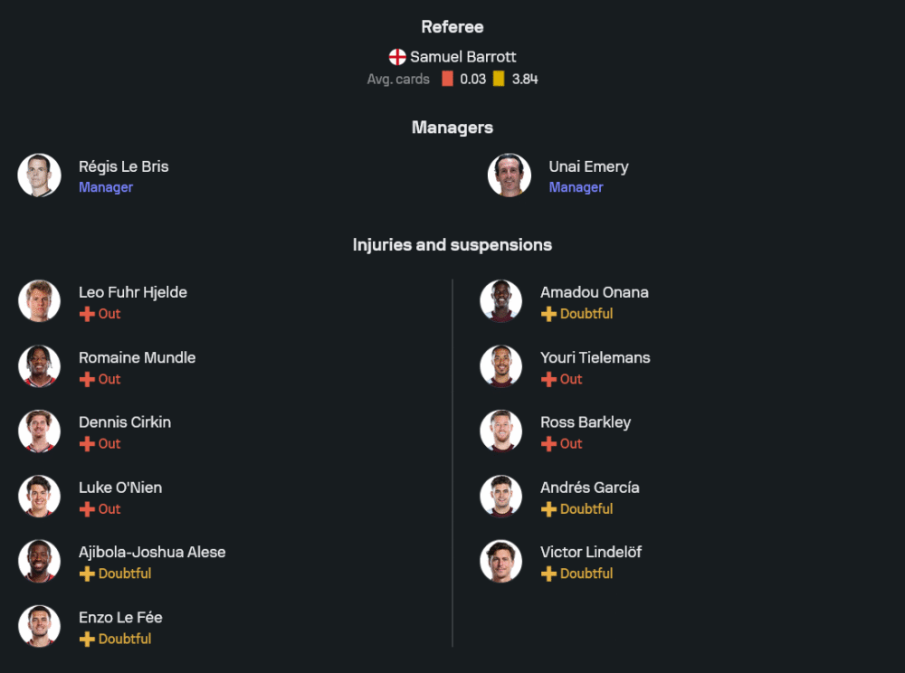 กุนซือ เรชิส เลอ บริส เจอปัญหาผู้เล่นบาดเจ็บเป็นขบวน ทั้ง โรเมน มันเดิ้ล, เอ็นโซ่ เลอ ฟี, เลโอ ฮเยลเด้, ลุค โอเนียน และเดนนิส เซอร์กิ้น ทำให้ตัวเลือกจำกัดพอสมควร แต่ยังพอเบาใจได้เพราะตัวหลักหลายคนฟอร์มกำลังเข้าที่ โดยแนวรุกจะฝากความหวังไว้ที่ วิลซง อิซิดอร์, เชมส์ดีน ตาลบี้ และซิมง อาดิงกร้า สามประสานแดนหน้า พร้อมสนับสนุนจากแดนกลางอย่าง กรานิต ชาก้า และ โนอาห์ ซาดิกี้ ที่กำลังเล่นได้ดุดัน