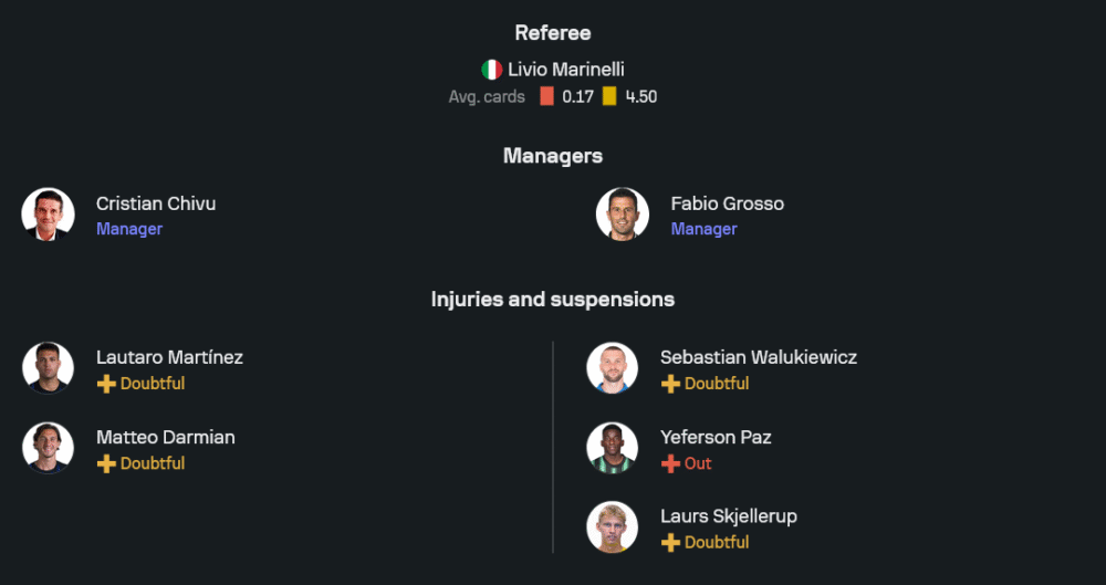 สถานการณ์ตัวผู้เล่นของงูใหญ่มีข่าวดีหลายจุด เริ่มจาก เลาตาโร่ มาร์ติเนซ ที่ได้พักกลางสัปดาห์กลับมาฟิตพร้อมยืนหอกคู่กับ มาร์คุส ตูราม ในระบบ 3-5-2 ส่วนแผงกลางยังคงคึกคักด้วย ฮาคาน ชัลฮาโนลู คุมจังหวะ ร่วมกับ นิโคโล่ บาเรลล่า และ เปตาร์ ซูซิช ที่กำลังหาโมเมนตัมการเล่นในสีเสื้องูใหญ่ได้ดีขึ้นเรื่อย ๆ ด้านวิงแบ็กสองข้างใช้ เดนเซล ดุมฟรีส์ กับ เฟเดริโก้ ดิมาร์โก้ เติมเกมกว้าง ขณะที่แผงหลังสามคนวางใจ มานูเอล อาคานยี่, ฟรานเชสโก้ อแชร์บี้ และ อเลสซานโดร บาสโตนี่ นายทวารยังเป็น ยานน์ ซอมเมอร์ ที่ยืนระยะได้อย่างแน่นอน หากมีจุดต้องระวังก็คือความฟิตของบางแกนที่ใช้งานถี่ แต่ด้วยคุณภาพขุมกำลังและความหนาของม้านั่งสำรอง อินเตอร์ยังเหนือกว่าอย่างชัดเจน