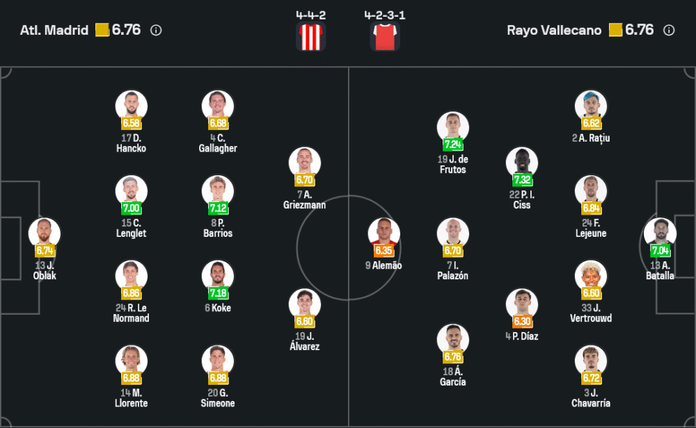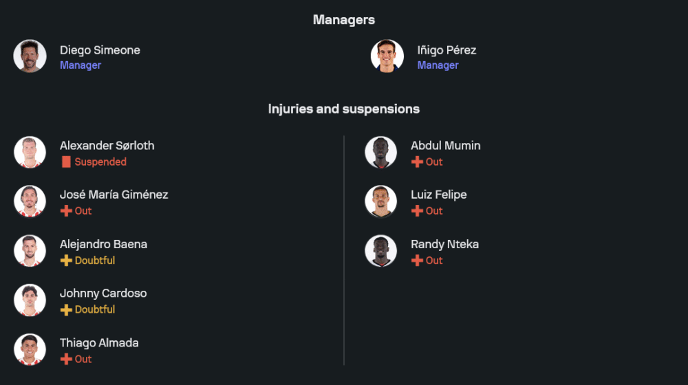 ดีเอโก้ ซิเมโอเน่ เจอปัญหาตัวหลักหายไปพอสมควร อเล็กซานเดอร์ ซอร์ลอธ กองหน้าตัวเก่งติดโทษแบน ขณะที่ โฮเซ่ ฆิเมเนซ และ ติอาโก้ อัลมาด้า ยังเจ็บยาว รวมถึง อเล็กซานโดร บาเอน่า ที่ต้องเช็กฟิต แต่ยังดีที่มีแข้งฟิตพร้อมอย่าง กรีซมันน์, อัลวาเรซ, โกเก้ และ บาร์ริออส ลงประคองทีม โดยที่เกมรับมี เลอ นอร์ม็องด์ ยืนคุมแผงหลัง ส่วนยาน โอบลัค ยืนเฝ้าเสาตามเดิม