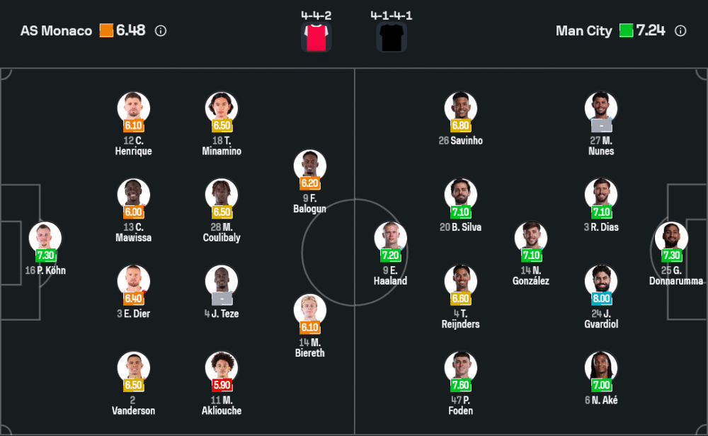 แมนฯซิตี้ (4-1-4-1) : จานลุยจิ ดอนนารุมม่า – มาเธอุส นูเนส, รูเบน ดิอาส, ยอสโก้ กวาร์ดิโอล, นาธาน อาเก้ – โรดรี้ – ซาวินโญ่, ฟิล โฟเด้น, ติยานี่ ไรย์นเดอร์ส, แบร์นาร์โด้ ซิลวา – เออร์ลิ่ง ฮาลันด์