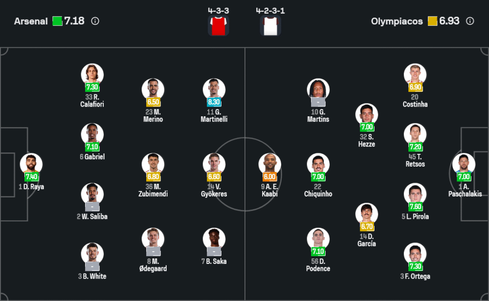 อาร์เซน่อล (4-2-3-1): ดาบิด ราย่า – เบน ไวท์, วิลเลี่ยม ซาลิบา, กาเบรียล มากัลเญส, ริคคาร์โด้ คาลาฟิโอรี่ – ดีแคลน ไรซ์, มาร์ติน ซูบิเมนดี้ – บูกาโย่ ซาก้า, เอเบเรชี่ เอเซ่, กาเบรียล มาร์ติเนลลี่ – วิคตอร์ โยเคเรส