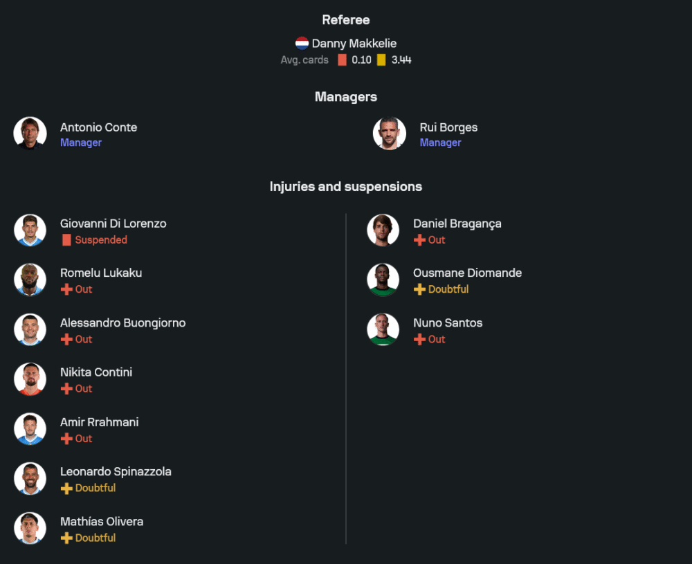 อันโตนิโอ คอนเต้ เจอปัญหาขุมกำลังพอสมควร ตัวหลักเจ็บยาวประกอบด้วย โรเมลู ลูกากู, อเลสซานโดร บูโอนจอร์โน่, อามีร์ ราห์มานี, นิกิต้า คอนตินี่ ส่วนสองฟูลแบ็ก เลโอนาร์โด้ สปินาซโซล่า กับ มาธิอัส โอลิเวร่า ต้องรอเช็กความฟิต ที่ช้ำเข้าไปอีกคือ โจวานนี่ ดิ ลอเรนโซ่ ติดโทษแบนจากเกมก่อน ทำให้ต้องปรับไลน์แบ็กขวา ระบบที่คาดคือ 4-1-4-1 ใช้ สตานิสลาฟ โลบ็อตก้า ยืนเดี่ยวหน้าแผงหลัง คุมจังหวะร่วมกับคู่ห้องเครื่อง ฟร้องค์ อันกีสซ่า และจอมปั้นเกมระดับเวิลด์คลาสอย่าง เควิน เดอ บรอยน์ ด้านริมเส้น มัตเตโอ โปลิตาโน่ กับ สกอตต์ แม็คโทมิเนย์ พร้อมช่วยไล่บีบและซัดไกล ส่วนหัวหอกฝากความหวังไว้ที่ ราสมุส ฮอยลุนด์ ที่ต้องคมกริบเมื่อมีโอกาส