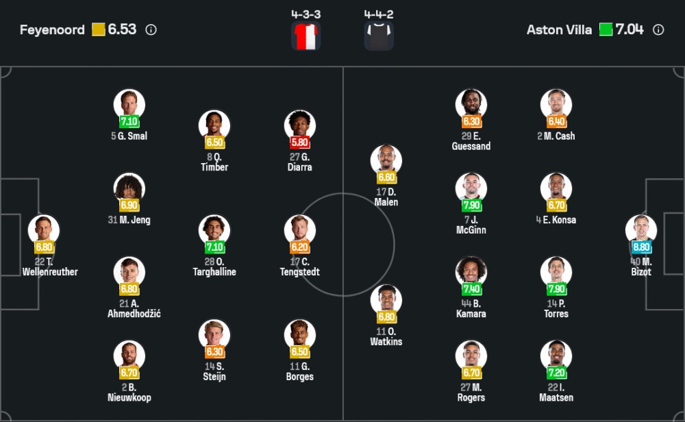 อีกหนึ่งไฮไลต์คือการดวลกลางสนาม หาก แม็คกินน์–กามาร่า สามารถตัดเกมและบังคับทิศทางบอลไปไว้ตามที่ต้องการ เฟเยนูร์ดจะเสียความต่อเนื่องทันที ตรงกันข้าม หาก ตาร์ฆาลีน และเพื่อนๆ หาช่องจ่ายทะลุหลังโซนได้บ่อย บิโซต์อาจต้องออกแรงเซฟหลายครั้ง เกมนี้จึงมีโอกาสเปิดแลกตั้งแต่ต้น แต่ความละเอียดและความนิ่งของวิลล่านอกบ้านดูเหนือกว่าครึ่งก้าว
