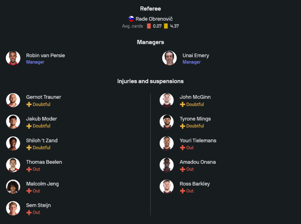 ฝั่งทีมเยือนของ อูไน เอเมรี สภาพทีมมีแข้งเดี้ยงค้างอย่าง ยูรี่ ตีเลอม็องส์, อมาดู โอนาน่า และ รอสส์ บาร์คลีย์ ขณะที่ ไทโรน มิงส์ กับ จอห์น แม็คกินน์ ต้องเช็กฟิต แต่โครงหลักยังแน่น ผู้รักษาประตูเป็น มาร์โก บิโซต์ แผงแบ็กโฟร์เรียงจากขวาไปซ้าย แม็ตตี้ แคช, เอซรี่ คอนซา, ปาอู ตอร์เรส และ เอียน มัตส์เซ่น คู่กลางรับมอบหมายให้ บูบาการ์ กามาร่า คุมจังหวะร่วมกับกัปตัน แม็คกินน์ หากผ่านฟิต แนวรุกสามประสานจัด เอวานน์ เกาส์ซ็องด์ ทางขวา, มอร์แกน โรเจอร์ส กลางรุก และ เอมิเลียโน่ บูเอนเดีย ทางซ้าย สนับสนุนหอกเป้า ดอนเยลล์ มาเล่น ที่พร้อมเล่นบอลทะลุช่องและโจมตีพื้นที่หลังไลน์สูงของเจ้าถิ่น