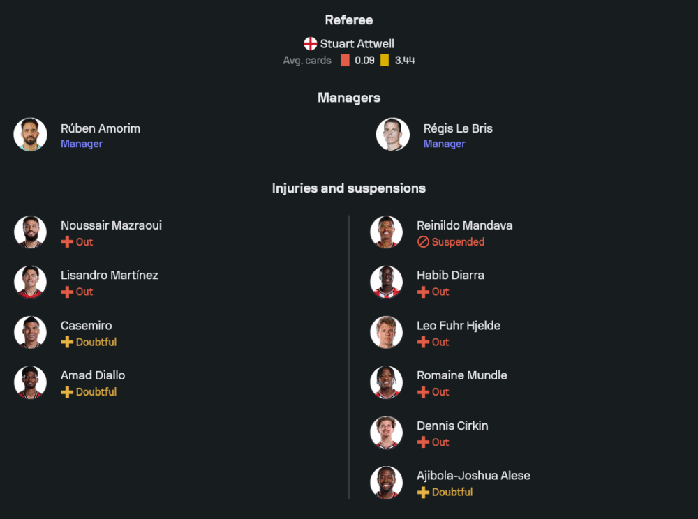 เกมนี้ “รูเบน อาโมริม” จัดผัง 3-4-2-1 วาง เบนยามิน เชสโก้ ล่าตาข่าย โดยมี บรูโน่ แฟร์นานเดส และ มาเธอุส คุนญ่า คอยสอดแทรก ส่วนทีมเยือนของ เรชิส เลอ บริส มาในระบบ 4-2-3-1 ใส่ วิลซง อิซิดอร์ ยืนหน้าเป้า โดยมี คริส ริกก์, เอ็นโซ่ เลอ ฟี, และ เชมส์ดีน ตาลบี้ ปั้นเกม ข้างหลังมี กรานิต ชาก้า ยืนคู่ โนอาห์ ซาดิกี้ คุมแดนกลาง ผู้ตัดสินคือ สจ๊วต แอ็ตต์เวลล์ ซึ่งเป็นเปาสายปล่อยเกมแต่แจกเหลืองเฉลี่ยสูงพอตัว