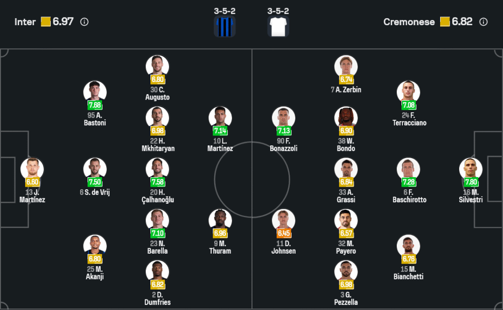 อินเตอร์ของคิววูกำลังไหลลื่นจากชัยชนะต่อเนื่องในลีกและยุโรป แม้จะมีข่าวร้ายเรื่องอาการเจ็บกล้ามเนื้อของ มาร์คุส ตูราม ทำให้ต้องปรับหน้าเป้า แต่ภาพรวมยังแน่นปึ้กตามสไตล์เกมรุกไดนามิก 3-5-2 แผงหลังสามคนมี สเตฟาน เดอ ฟราย คุมเกม ริมเส้นฝั่งขวาฝากความเร็วและพลังกับ เดนเซล ดุมฟรีส์ ฝั่งซ้ายใช้ คาร์ลอส ออกุสโต้ หรือ เฟเดริโก้ ดิมาร์โก้ เติมดุดัน กลางสามบีบพื้นที่ที่เด่นทั้งรับและรุกคือ บาเรลล่า จับคู่ ชัลฮาโนลู และ มคิตาร์ยาน พร้อมปล่อย เลาตาโร่ ยืนเป็นหัวใจแนวหน้า โดยมีตัวช่วยใหม่รอเซอร์ไพรส์ในกรอบเขตโทษ