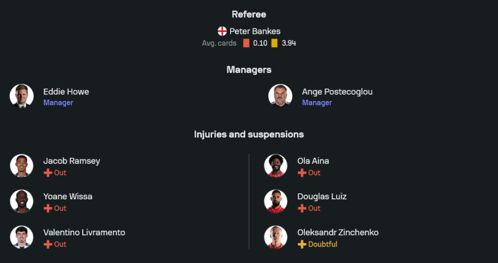 ฝั่งทีมเยือนของกุนซือ อังเก้ ปอสเตโคกลู เจอปัญหาผู้เล่นบาดเจ็บเช่นกัน โดยไม่มี โอล่า ไอน่า, ดั๊กลาส หลุยส์, และ อังกัส กันน์ ที่เดี้ยงยาว รวมถึง โอเล็คซานเดอร์ ซินเชนโก้ ที่ยังไม่ฟิตสมบูรณ์ ต้องรอเช็กสภาพก่อนเกม ระบบที่เตรียมใช้คือ 4-2-3-1 โดยมี คริส วู้ด ยืนเป็นหน้าเป้าตัวหลัก และใช้แนวรุกสามคนอย่าง มอร์แกน กิ๊บบ์ส-ไวท์, คัลลั่ม ฮัดสัน-โอดอย, และ ดิลาเน่ บัควา ปั้นเกมสนับสนุน ขณะที่แดนกลางวาง อิบราฮิม ซ็องกาเร่ กับ เอลเลียต แอนเดอร์สัน คอยคุมจังหวะ ส่วนแนวรับนำโดย นิโคล่า มิเลนโควิช กับ โมราโต้ ปักหลักช่วยกันสกัดเกมรุกเจ้าถิ่น