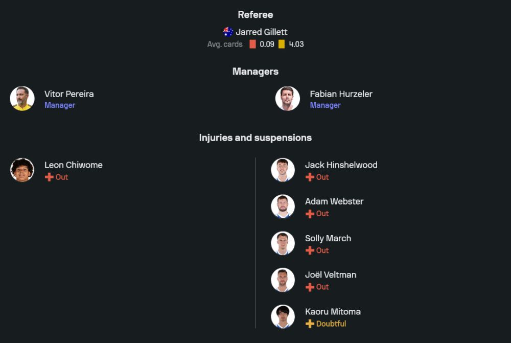 ลูกทีมของ วิตอร์ เปไรร่า ยังคงเจอปัญหาขาดตัวหลักจากอาการบาดเจ็บ โดยเฉพาะ เลออน ชิโวม และ ไค-ยาน่า โฮเวอร์ ที่ยังไม่พร้อมลงสนาม อย่างไรก็ตาม กุนซือชาวโปรตุเกสเตรียมจัดทีมในระบบ 4-3-3 ใช้สามแนวรุกอย่าง ฮวาง ฮี ชาน, ยอร์เก้น สแตรนด์ ลาร์เซ่น, และ จอห์น อาริอาส ล่าตาข่าย ส่วนแดนกลางวาง อันเดร ตรินดาเด้ คุมจังหวะร่วมกับ มาร์แชลล์ มูเน็ตซี่ และ เชา โกเมส แนวรับยังคงเป็นหน้าที่ของ ซานติอาโก้ บูเอโน่ กับ ลาดิสลาฟ เครย์ซี่ โดยมี แซม จอห์นสโตน เฝ้าเสา