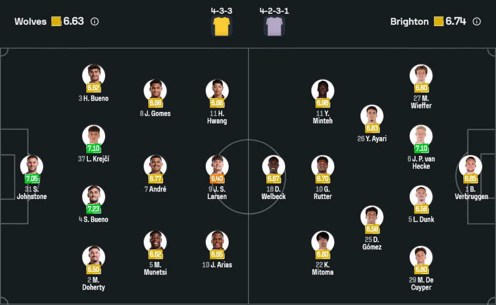 ฝั่งทีมเยือนของ ฟาเบียน ฮูร์เซเลอร์ ยังมีปัญหาผู้เล่นบาดเจ็บยาวหลายราย ทั้ง โยแอล เฟลต์มัน, แจ็ค ฮินเชลวู้ด, โซโลม่อน มาร์ช และ อดัม เว็บสเตอร์ ขณะที่ คาโอรุ มิโตมะ ยังต้องรอเช็กความฟิต แต่ตัวหลักยังอยู่กันครบ โดยจะมาในระบบ 4-2-3-1 มี แดนนี่ เวลเบ็ค ยืนหน้าเป้า ขนาบข้างด้วย ยานกูบา มินเตห์ และ คาโอรุ มิโตมะ (หากผ่านฟิต) ส่วนเบื้องหลังมี จอร์จินิโอ้ รุตเตอร์ ปั้นเกม ขณะที่แดนกลางคุมโดย ดิเอโก้ โกเมซ และ ยาซิน อายารี่ แนวรับมี ลูอิส ดังค์ เป็นผู้นำ และ บาร์ต แฟร์บรู้กเก้น ลงเฝ้าเสา