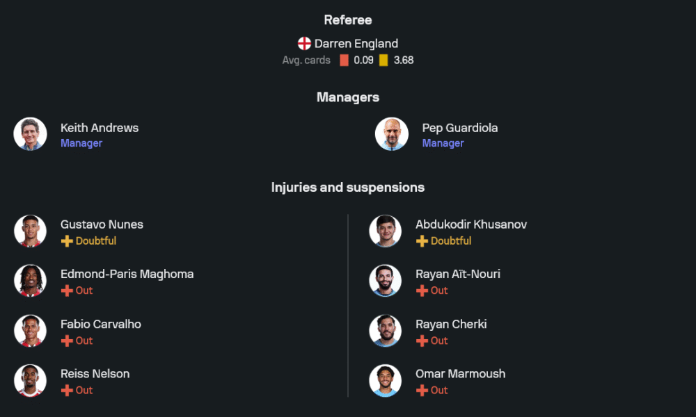 เป๊ป กวาร์ดิโอล่ายังคุมโทนด้วย 4-1-4-1 วางเครื่องจักรสังหาร เออร์ลิ่ง ฮาลันด์ เป็นหน้าเป้าพร้อมซุ่มยิง ด้านหลังเป็นไลน์เพลย์เมคเกอร์สี่คนที่อันตรายทุกจังหวะ ฟิล โฟเด้น ประกบ ติยานี่ ไรย์นเดอร์ส ขนาบด้วยปีกสปีดจัด เฌเรมี่ โดกู และจอมเทคนิค แบร์นาร์โด้ ซิลวา ตัดเกมหน้ากองหลังใช้ โรดรี ที่ยืนปักหลักเป็นสมองของทั้งทีม แนวรับเรียงตัว มาเธอุส นูเนส ยืนแบ็กขวาชั่วคราว ขณะที่คู่เซ็นเตอร์คือ รูเบน ดิอาส กับ ยอสโก้ กวาร์ดิโอล แบ็กซ้ายเป็น นิโก้ โอเรลลี่ ผู้เฝ้าเสาคือ จานลุยจิ ดอนนารุมม่า รายชื่อนักเตะเดี้ยงยังมี โอมาร์ มาร์มูช, รายาน แชร์กี, อับดูโคดีร์ คูซานอฟ, รายาน ไอต์-นูรี่ ซึ่งลดทางเลือกหมุนเวียนเล็กน้อย แต่โครงสร้างหลักยังแน่น