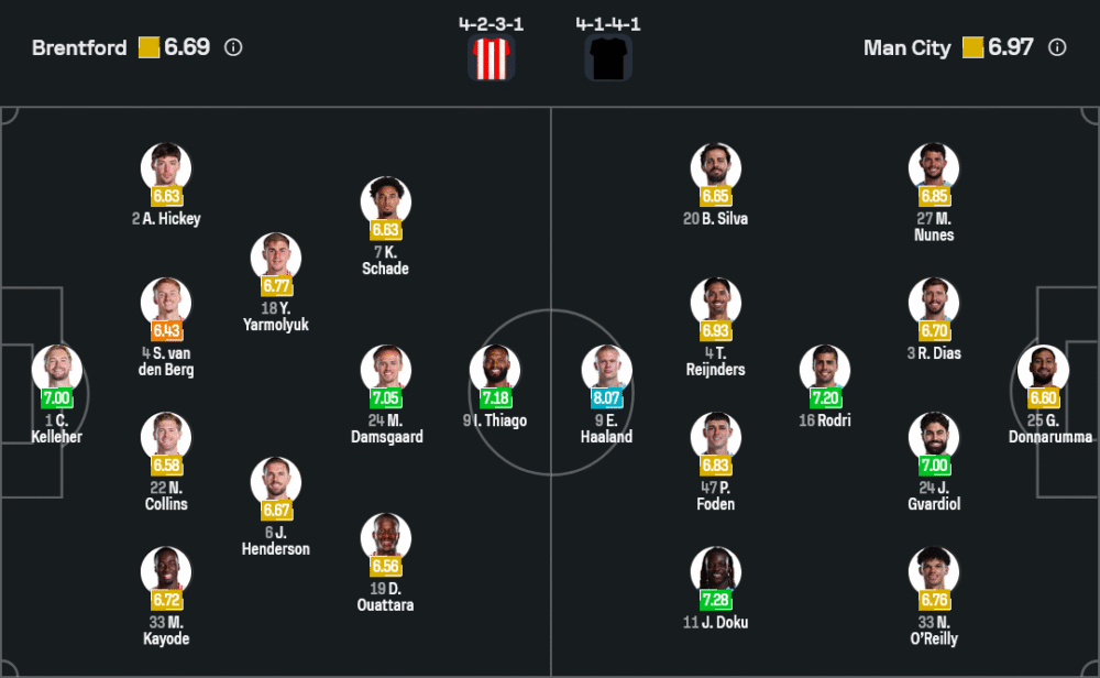ภาพรวมทางแท็คติกชัดเจนว่าเบรนท์ฟอร์ดจะถอยตั้งโซนกลางต่ำ รอฉกฉวยจังหวะสวนด้วยสปีดของ ชาเด้อ และการทะลุช่องของ ดัมส์การ์ด กับ อูอัตตาร่า ขณะที่ด้านบนปล่อยให้ อิกอร์ ธิอาโก้ เบียดบังพื้นที่กับคู่เซ็นเตอร์เรือใบ จุดแข็งของผึ้งน้อยคือแรงปะทะและลูกกลางอากาศ แต่จุดอ่อนคือการป้องกันระยะสองและการตามงานตัววิ่งไลน์สองที่หลุดจากครึ่งซ้ายขวา และนั่นคือช่องที่ โฟเด้น กับ โดกู ถนัดที่สุด