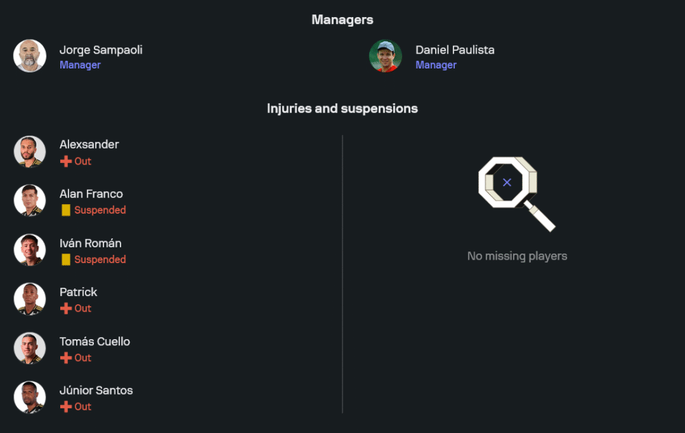 ดาเนียล เปาลิสต้า ไม่มีปัญหาผู้เล่นบาดเจ็บหรือติดโทษแบน ทำให้สามารถจัดทีมชุดที่ดีที่สุดลงสนาม เกมนี้จะมาในระบบ 4-2-3-1 นำทัพโดย เดอริค ลาเซอร์ด้า ยืนค้ำเป็นกองหน้าตัวเป้า โดยมี โรมารินโญ่, ไฮออราน และ มาเธอซินโญ่ สนับสนุนแนวรุกจากด้านหลัง คู่กลางใช้ ซี. ริเวร่า กับ อาร์. เมเนเซส ช่วยเชื่อมเกม ส่วนแนวรับวางใจ อี. วาสโกนเซลอส กับ แอล. แคนดิโด้ ที่ฟอร์มกำลังเข้าฝัก