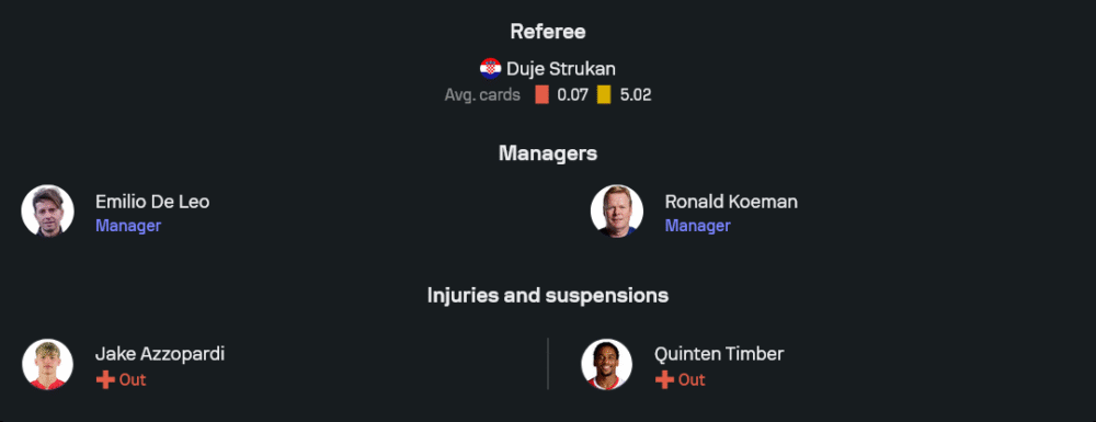 โรนัลด์ คูมัน เรียกตัวหลักกลับมาครบและพร้อมลุยด้วยแผนถนัด 4-3-3 นายทวาร บาร์ต แฟร์บรุ๊คเก้น พร้อมเซฟ แผงหลังมี เดนเซล ดัมฟรีส์ เติมเกมทางขวา คู่เซ็นเตอร์เป็น สเตฟาน เดอ ฟราย จับคู่ เวอร์จิล ฟาน ไดค์ ซึ่งเป็นหัวใจสำคัญเรื่องลูกกลางอากาศ ด้านซ้าย นาธาน อาเก้ คุมเกมรุกเกมรับได้สมดุล กลางสามใช้ จอร์ดี้ เชาเทน เชื่อมจังหวะร่วมกับ ทิยานี่ เรย์น์เดอร์ส และ ไรอัน กราเฟนเบิร์ช เพื่อคุมเทมโป ก่อนปล่อยสามหอกตัวจี๊ด ดอนเยล มาเล่น ขยับด้านขวา เมมฟิส เดปาย ยืนค้ำเป็นหน้าเป้า และ โคดี้ กัคโป โจมตีจากซ้าย ซึ่งทั้งสามคนสลับตำแหน่งกันได้ตลอดเพื่อดึงแนวรับคู่แข่งออกจากพื้นที่เดิม