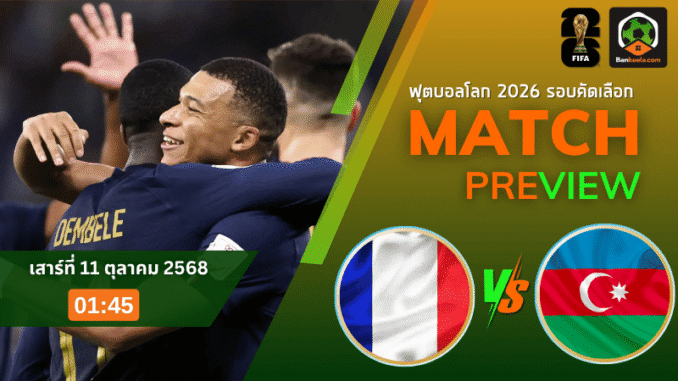 ค่ำคืนแห่งศึก ฟุตบอลโลก 2026 รอบคัดเลือก โซนยุโรป กลุ่มดี คืนวันเสาร์ที่ 11 ตุลาคม 2568 เวลา 01.45 น. ตามเวลาไทย บรรดาแฟนบอลทั่วโลกจับตาเกมใหญ่ที่สนาม ปาร์ค เดส์ แปรงส์ เมื่อ ฝรั่งเศส ยอดทีมเบอร์หนึ่งของกลุ่ม เตรียมเปิดรังต้อนรับการมาเยือนของ อาเซอร์ไบจาน ทีมรองบ่อนที่หวังสร้างปาฏิหาริย์ในแดนน้ำหอม เกมนี้ราคาบอลเปิดมาแบบไม่ไว้หน้าเจ้าบ้าน ต่อถึง 4 ลูก เต็ม บ่งบอกชัดว่าเป็นศึกที่ทั้งสองทีมยืนกันคนละระดับ สำหรับคอบอลที่กำลังไล่เช็ก ตารางบอลวันนี้ เกมนี้คืออีกหนึ่งแมตช์ที่ไม่ควรละสายตาแม้แต่วินาทีเดียว
