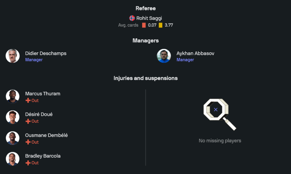 ทีมเยือนของกุนซือ อายคาน อับบาซอฟ ไม่มีปัญหาเรื่องผู้เล่นบาดเจ็บหรือโดนแบน ขุมกำลังชุดนี้สมบูรณ์ทุกตำแหน่ง นำโดยแนวรับแกร่งอย่าง อันตอน คริโวตซยุค และ เอลวิน บาดาลอฟ กลางสนามวางหัวใจหลักคือ เอมิน มาห์มูดอฟ ดาวซัลโวประจำทีมชาติที่ยิงไปแล้ว 14 ประตู คอยปั้นเกมรุกสนับสนุนคู่หัวหอก มาฮีร์ เอ็มเรลี และ เรนาต ดาดาโชฟ ระบบที่น่าจะใช้คือ 5-3-2 เน้นความเหนียวแน่นเป็นพิเศษและวางหมากสวนกลับเร็ว